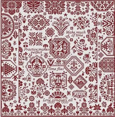 This monochromatic sampler has heraldic motifs as well as an alphabet, numbers, birds, and flowers. ...