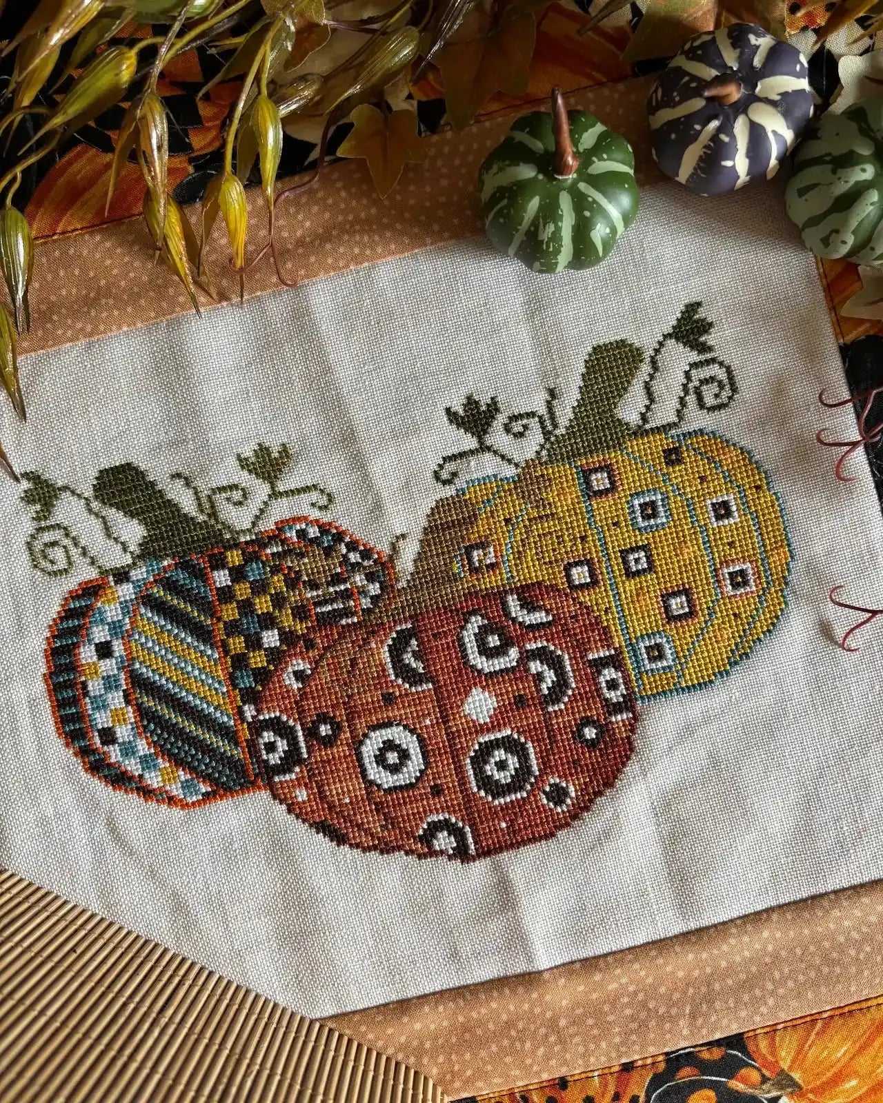 Three pretty pumpkins, stitched up in the loveliest colors for fall!