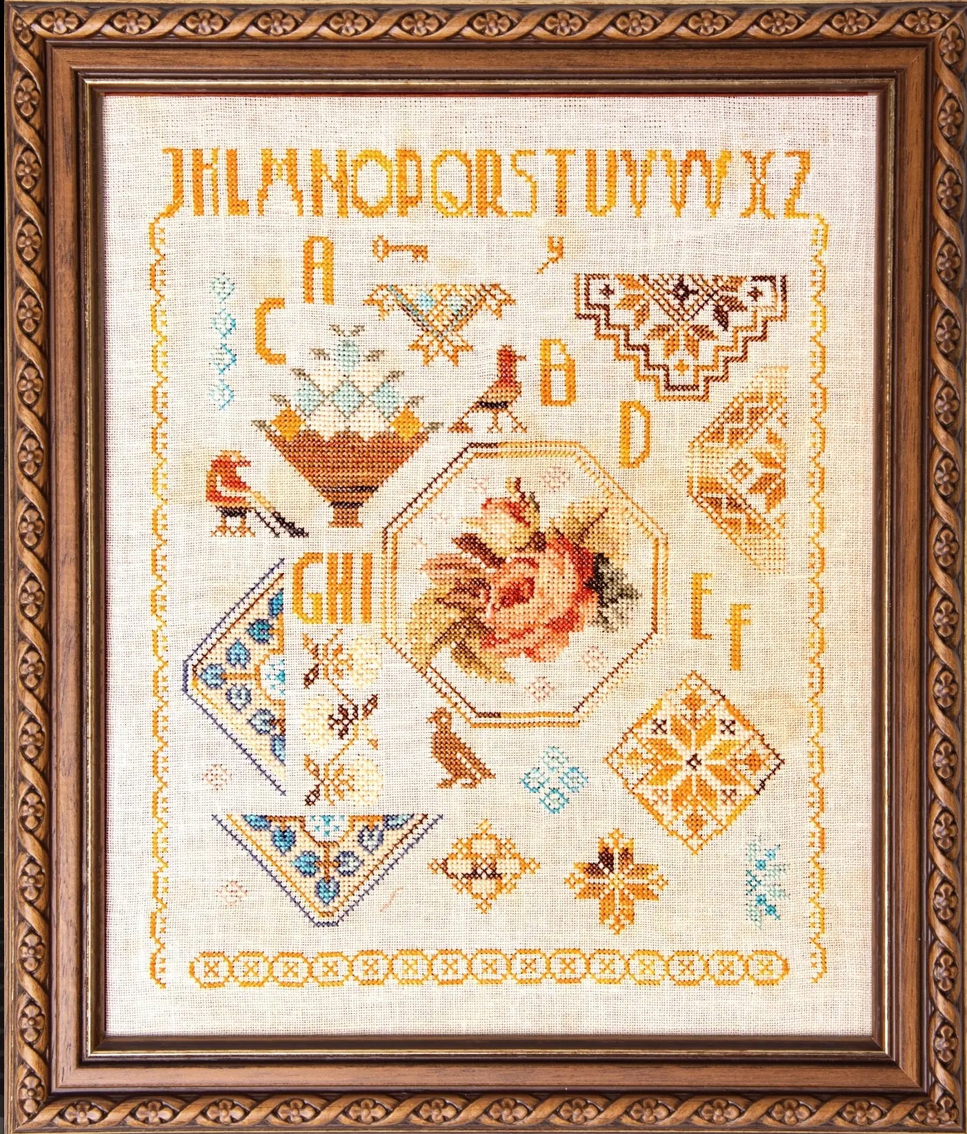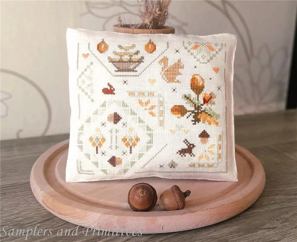 Autumn colors abound in this Quaker sampler with birds, flowers and a fruit basket. Stitch...