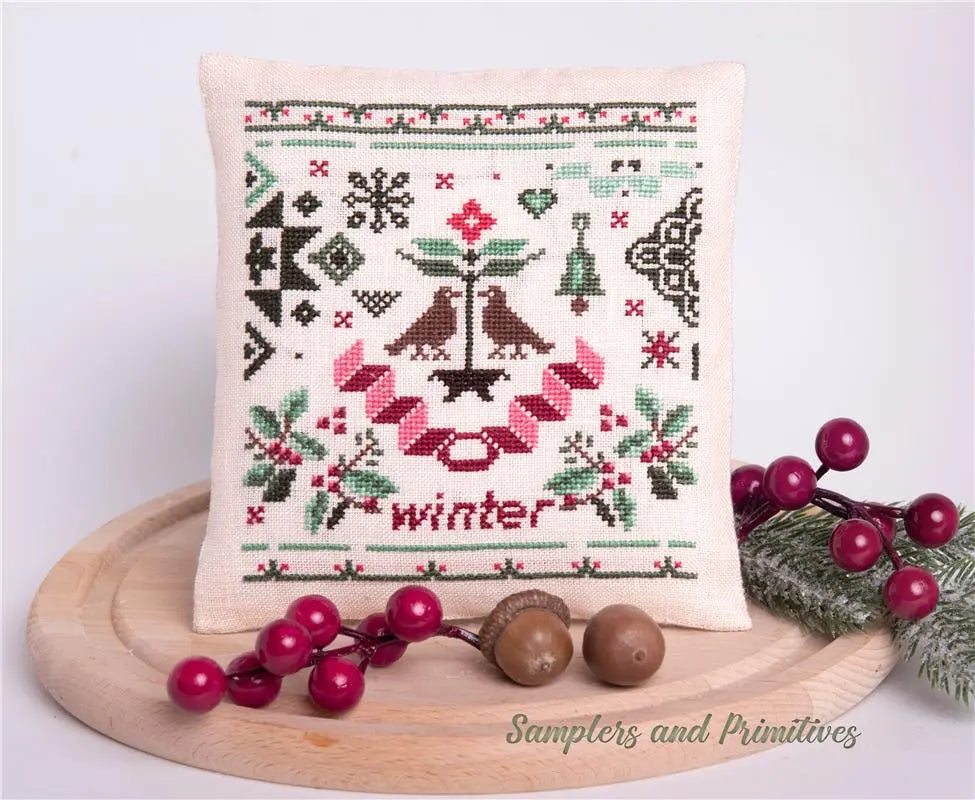 A pretty winter stitch with birds, holly berries, and Quaker motifs. Stitch Count: 83 x...