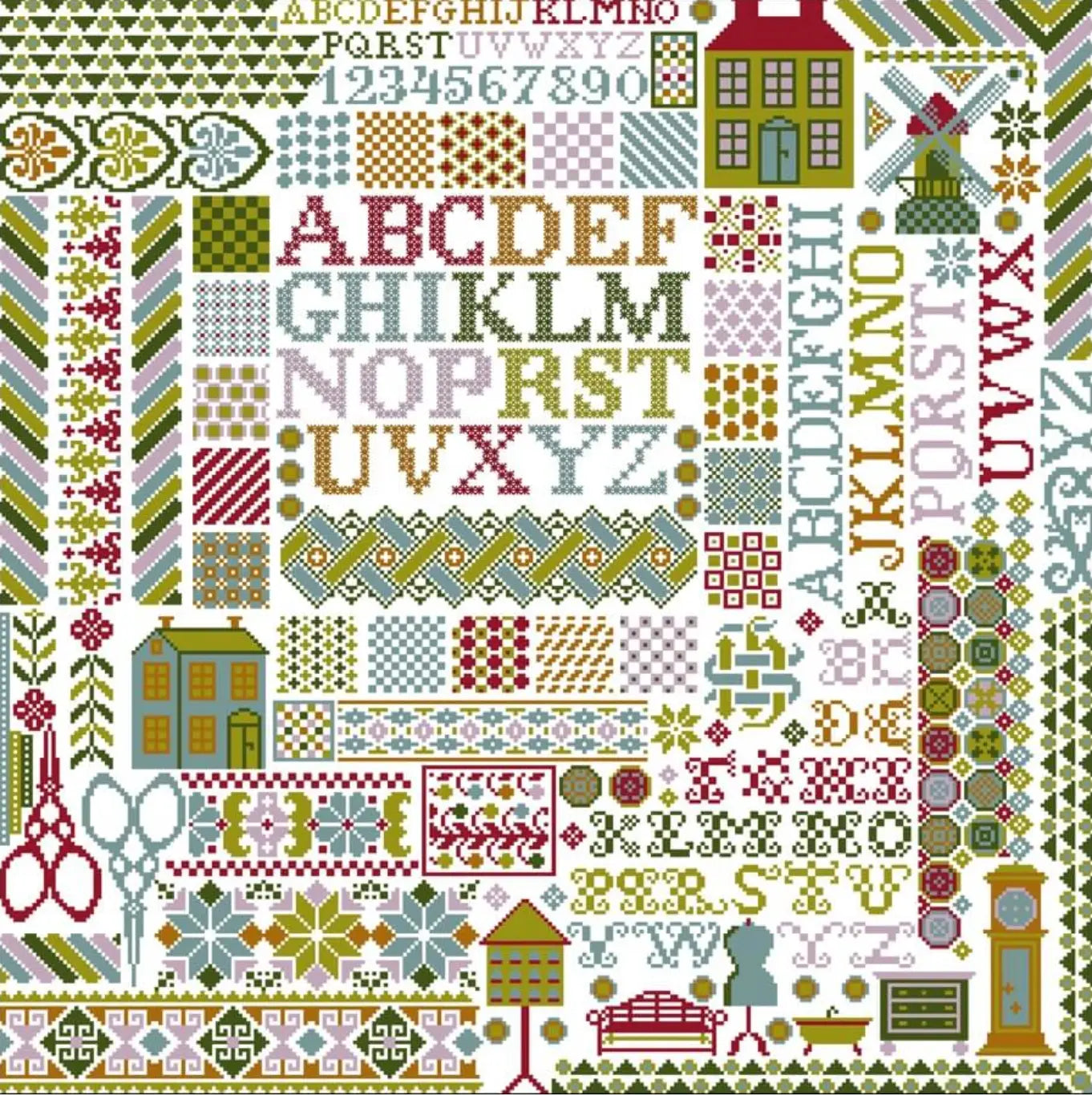 This one looks fun to stitch, doesn't it? Houses, a windmill, scissors and borders, alphabets...