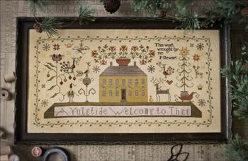 A big yellow house with a blooming flower pot on top - what a beautiful centerpiece for this sampler. The elf and reindeer give a nod to the holidays, while the cool peacocks and bird give a nod to quirky sampler motifs. Fun piece!
