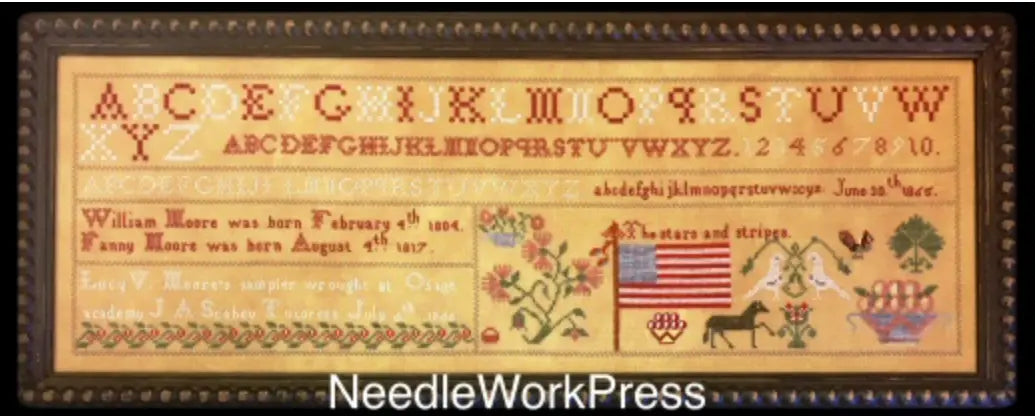 A patriotic sampler celebrating the stars and stripes, with information on where Lucy stitched her...