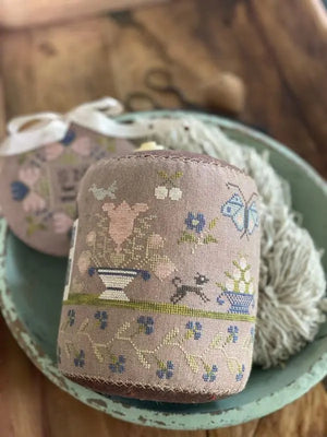 Beautiful soft colors, white house with flowers on the roof and a trailing vine below, dog chasing after that big butterfly - so many fun things!