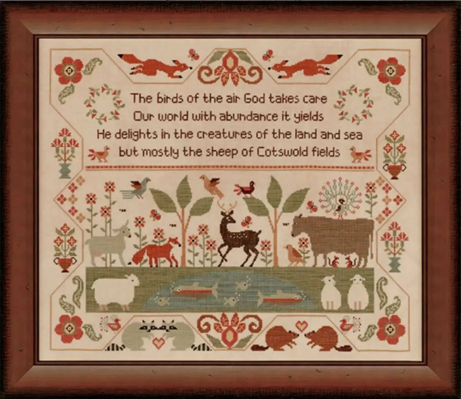 A stunning sampler featuring a cream colored house, stars borders, and beautiful animals and plants....