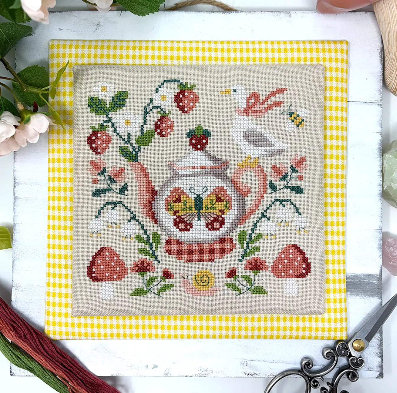 And why wouldn't a ribbon-bedecked goose be sitting on a teapot that is sprouting strawberries?...
