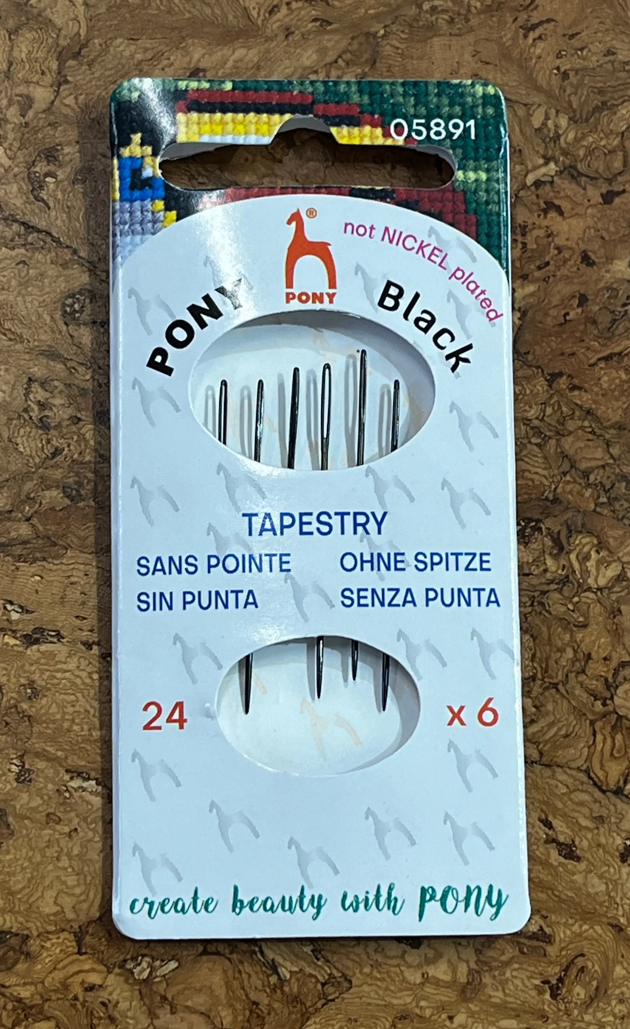 Pony Black Needles are made from oxidized high-carbon steel with no nickel plating for those who may be allergic to nickel. They feature a large eye for ease of threading, are approx. 1.5" long, and come 6 to a pack.