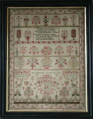 The subtitle on this pattern is "Big & Beautiful" and it really is. Both! Beautiful florals, baskets, trees, and animals. Over one stitching on the verses and her name. What a masterpiece.