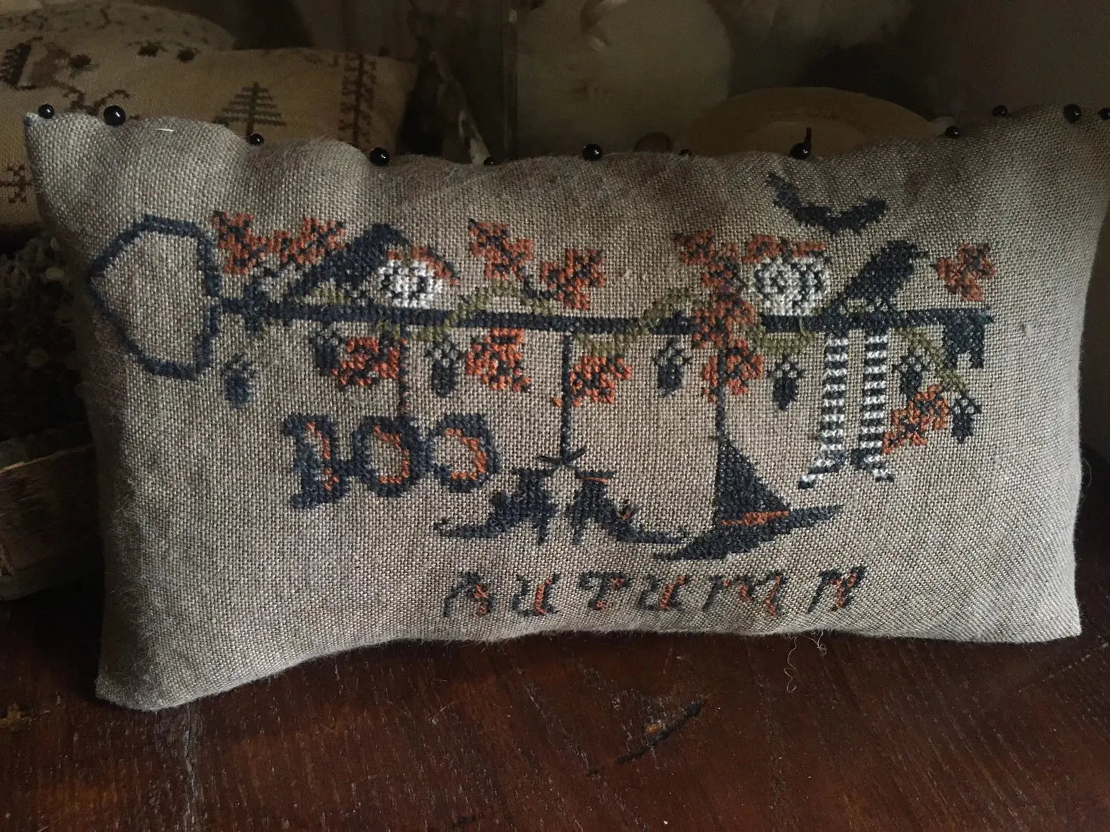 This pattern shows a spooky collection of items gathered on a giant key including a witch's hat, stockings, and shoes!
