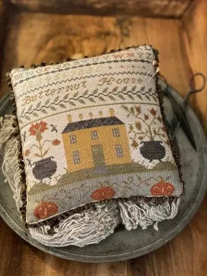 Beautiful fall sampler piece, with a cute pumpkin border at the bottom! Stitch and make into a pinkeep, or frame for your wall.