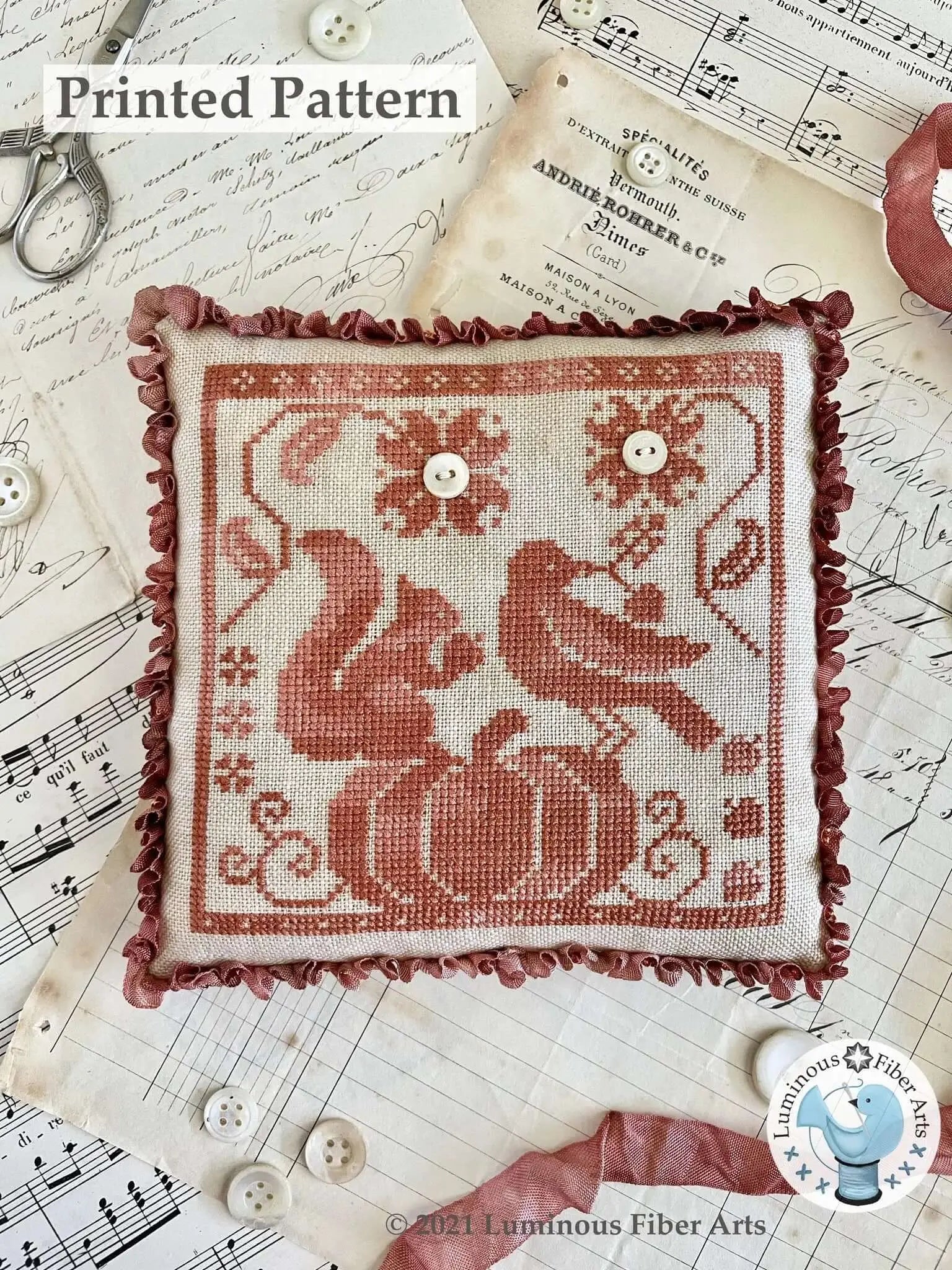 Third in a trio of small pillows, Gathering Acorns is a cute pillow that can be done in one color, or several if you choose! Buttons optional, but add texture and dimension to the piece.