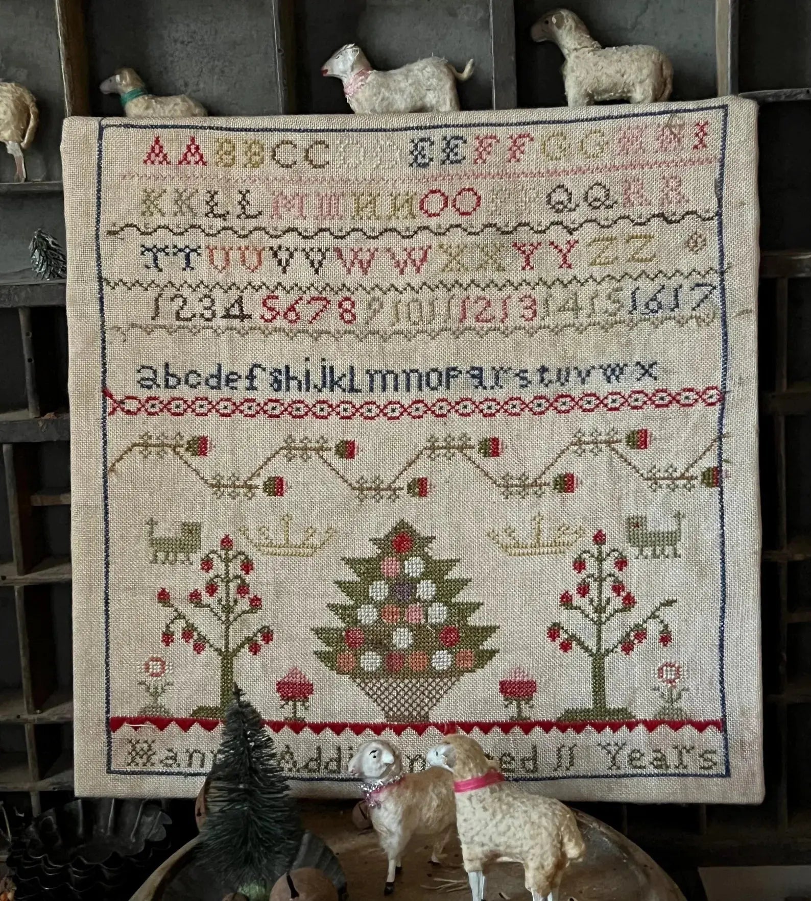 A sweet sampler featuring a unique berry basket, flowers, and two whimsical trees all in a lovely color palette.
