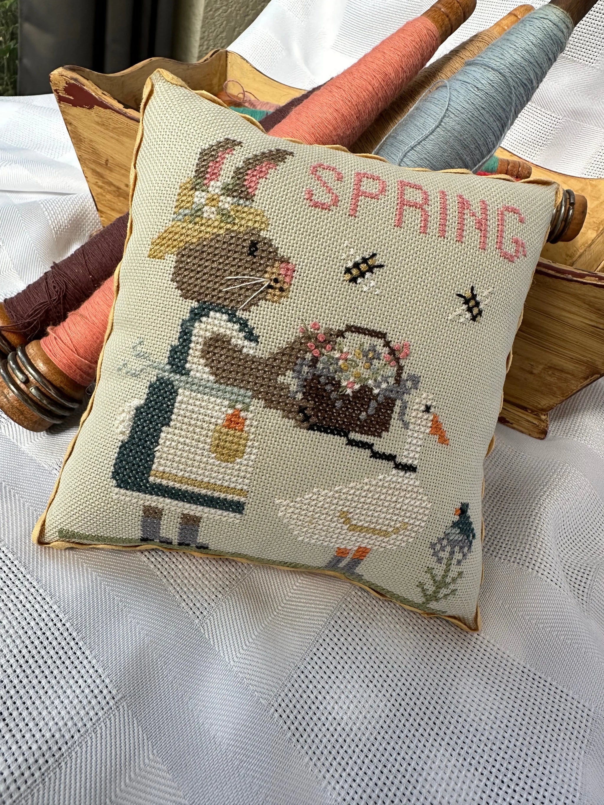 A sweet bunny with her straw hat, basket of flowers, carrot in the pocket for a snack, and goose friend by her side!