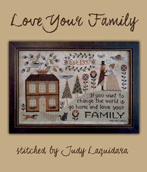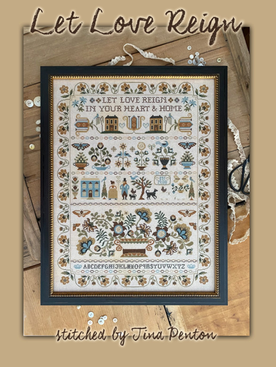 This gorgeous sampler is done in shades of sand and sea, and doesn't it look stunning? Houses, butterflies, interesting flowers, sweet border, and even a dog and cat. The booklet also contains a smaller Family Sampler, and a little heart-shaped pinkeep.