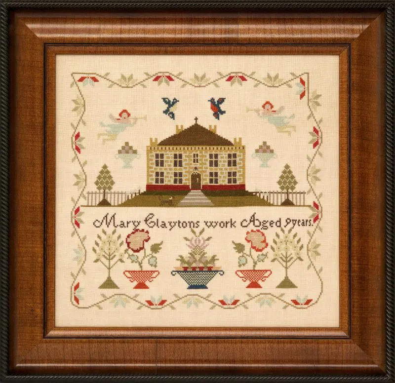This is a beautiful sampler, and no alphabet! Simple border, pretty brick house, and a linup of baskets and flowers at the bottom.