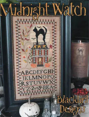 I'm not sure whether a giant black cat keeping watch over your house is a good thing or a scary thing, but he seems to be taking his job seriously! Cute stars on the roof and patchwork pumpkins, too.