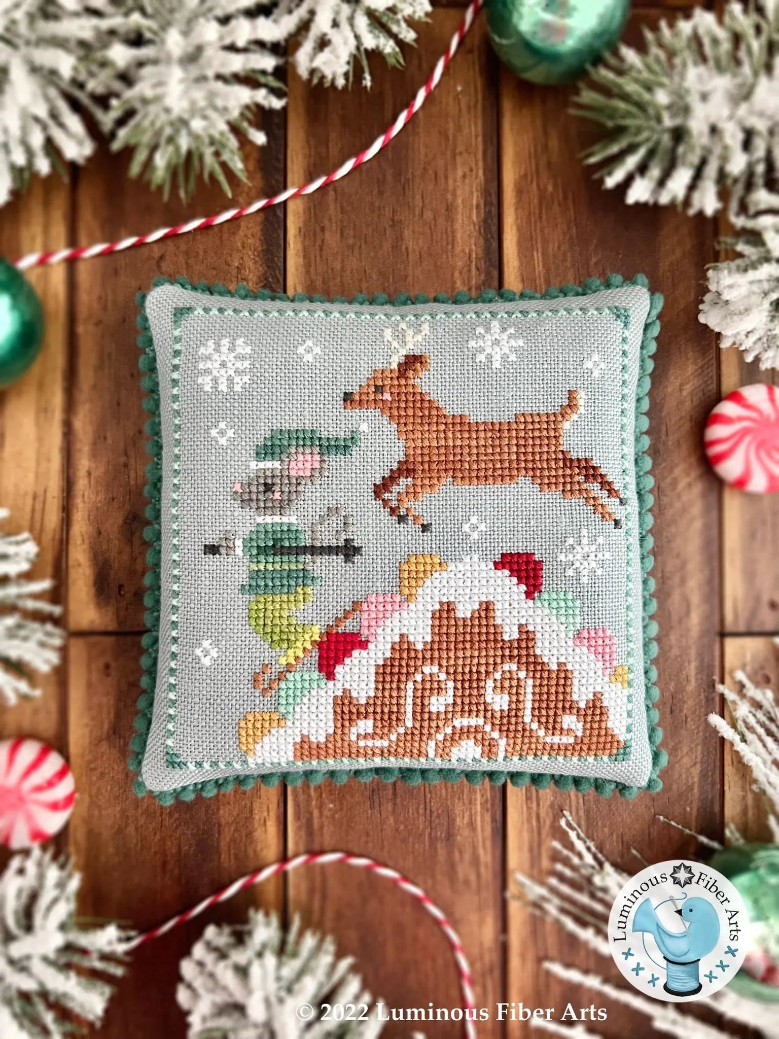 What if mice lived on the North Pole? I'm thinking this one might find himself in a bit of trouble, skiing down the gumdrop roofline like that. Seems like the reindeer is close behind, in case he needs to save the day.
