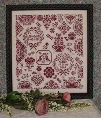 A beautifully designed red sampler with plenty of Quaker motifs and places to personalize, whether you use it to commemorate a wedding, and anniversary, or a birth.