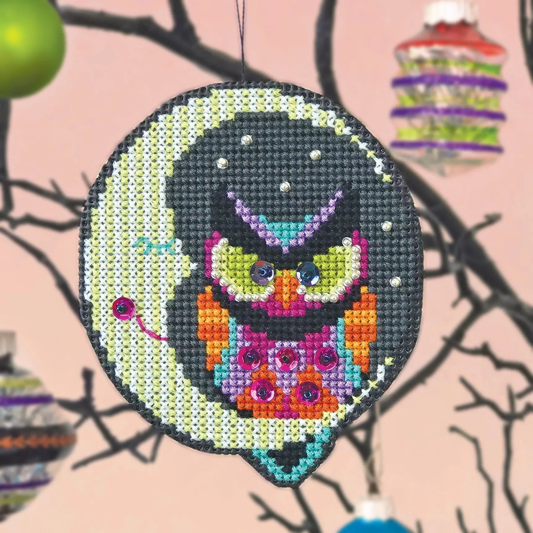 A colorful whoo-whoo-ter, resting in the crescent of the moon, watching over your house at night.