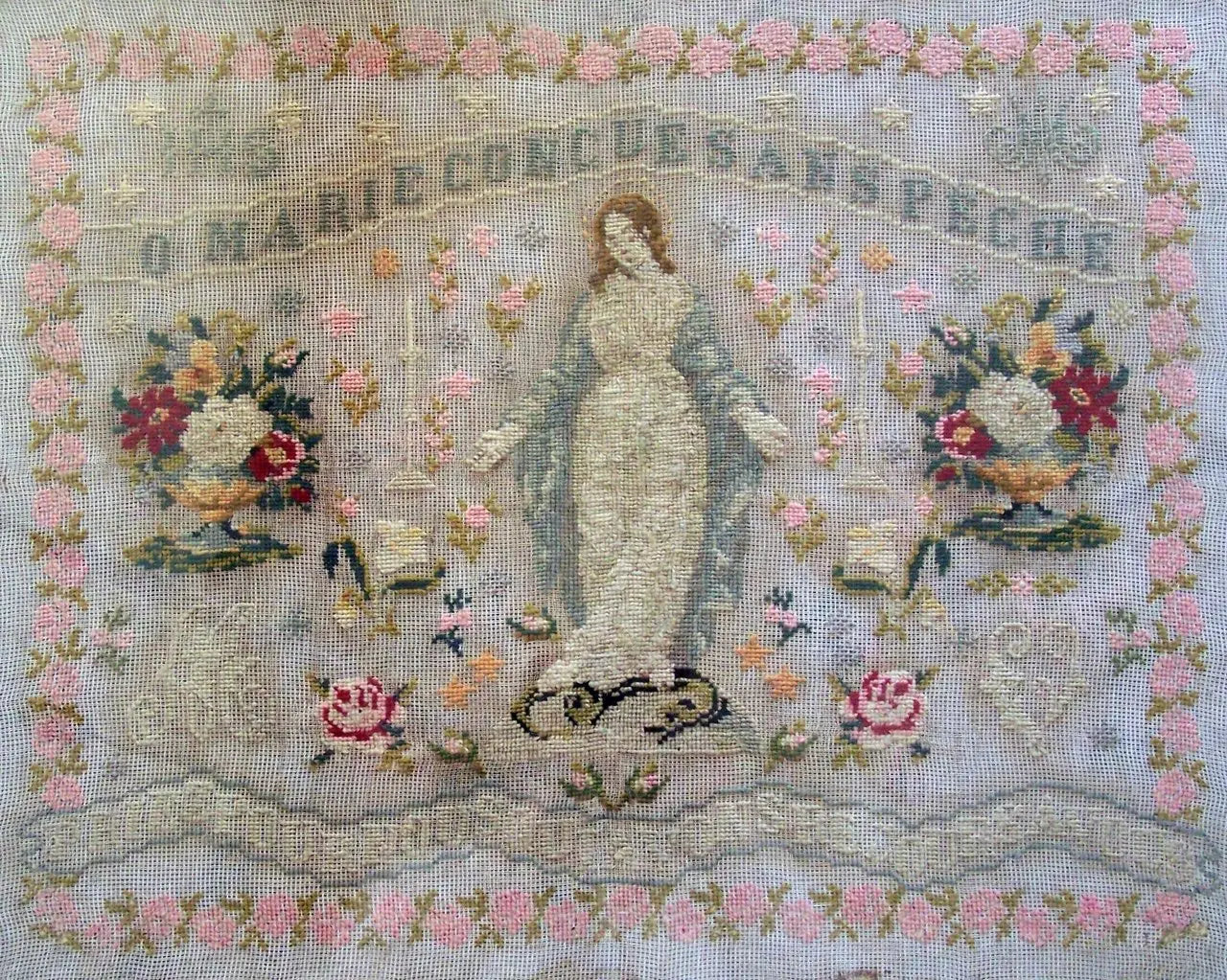 Reproduction of a French sampler. The translation is, "O Mary, conceived without sin, pray for us who have recourse to you."