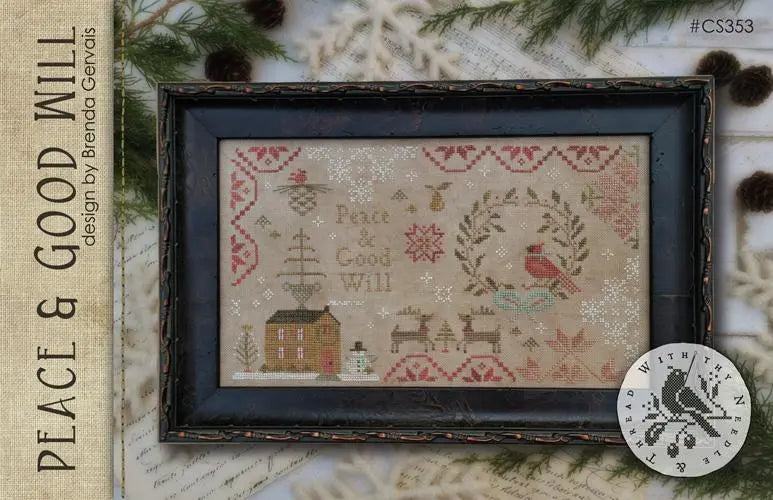 A winter scene that you can keep up through the holidays and well into Winter. This one features a house and snowman, Cardinal and deer, and pretty Quaker motifs around the border.