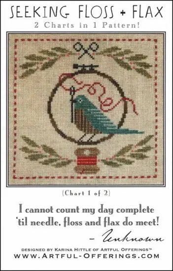 There are two charts in this pattern. The first chart is on the cover and has a bird with a needle and floss in its beak getting ready to stitch. The second chart has the words "Seeking Floss + Flax" with a garland that includes a pair of black scissors. Either one would be great for a smalls exchange or as a gift for a fellow stitcher.