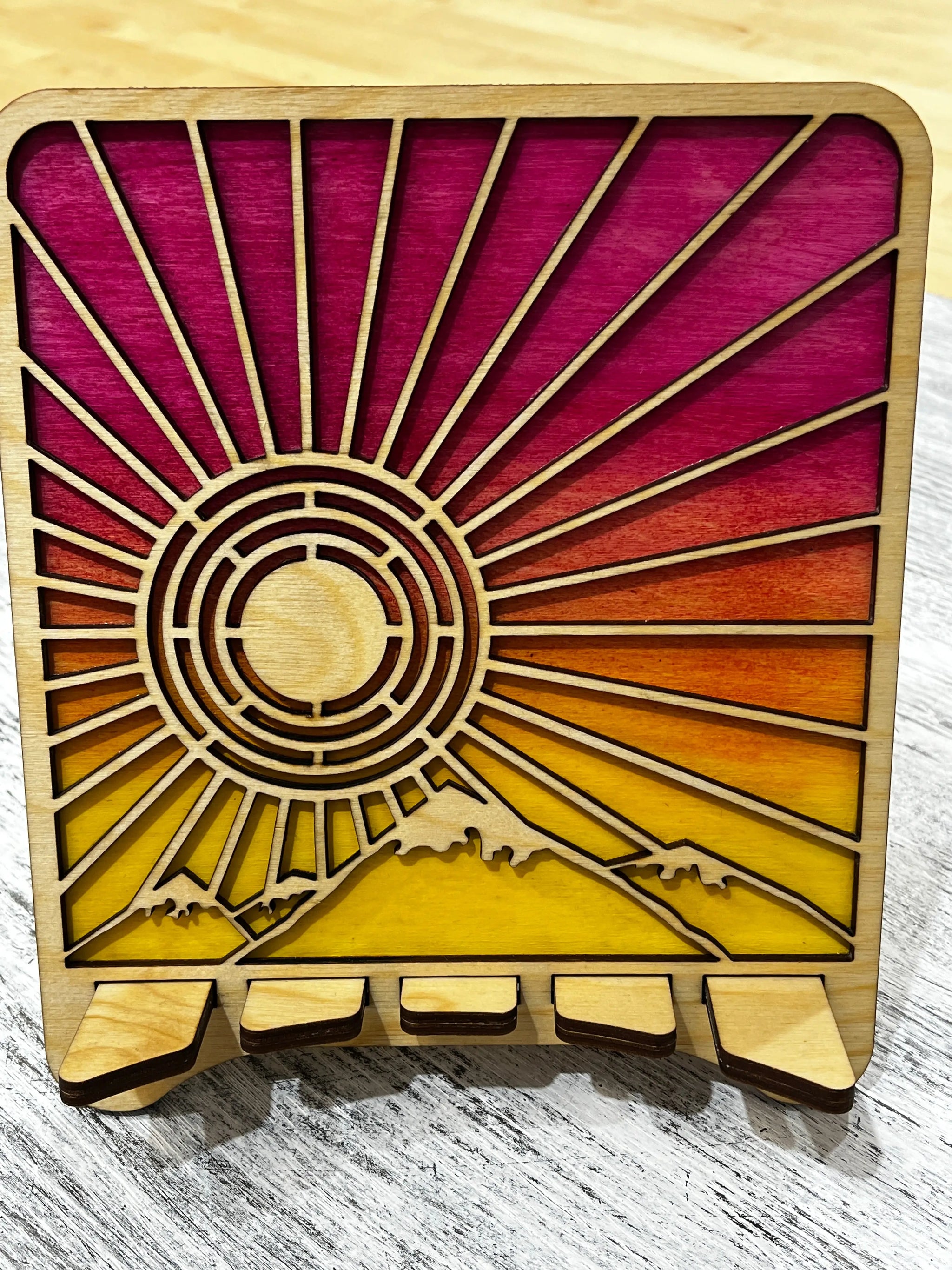 Handcrafted and laser but, with a beautiful pink and golden stain showing through behind the image.