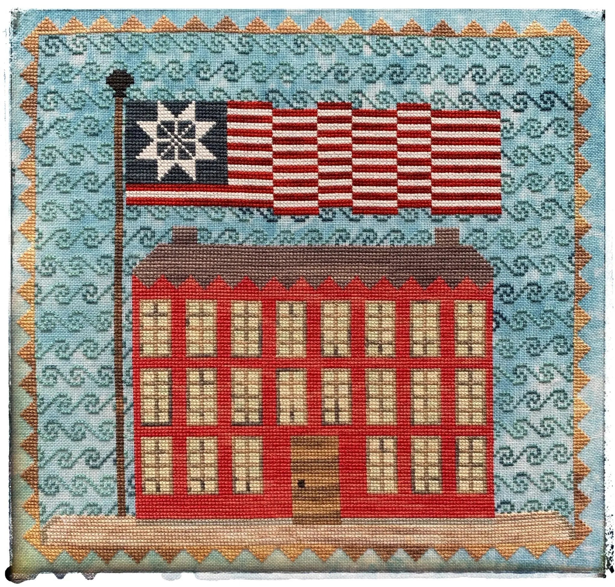 A fantastic red house (mansion!) surrounded by the peaceful rolling waves at the lake. And isn't that a fabulous flag? Might need to do that as a separate pillow.