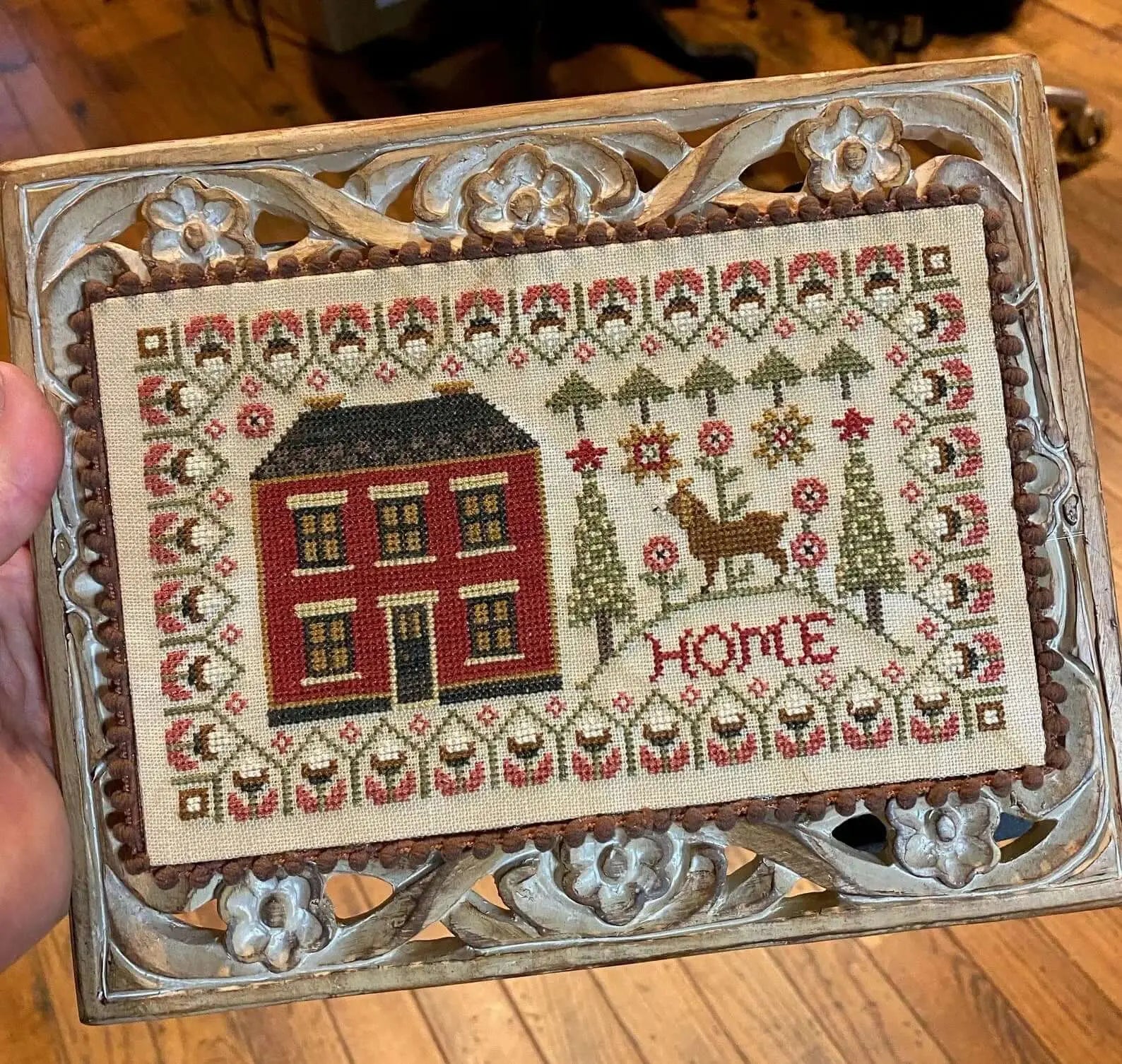 Even if your own home doesn't include a goat named Tilly in the side yard, this is a wonderful piece to stitch. Beautiful border, wonderful red house, and a Tilly in the forest.