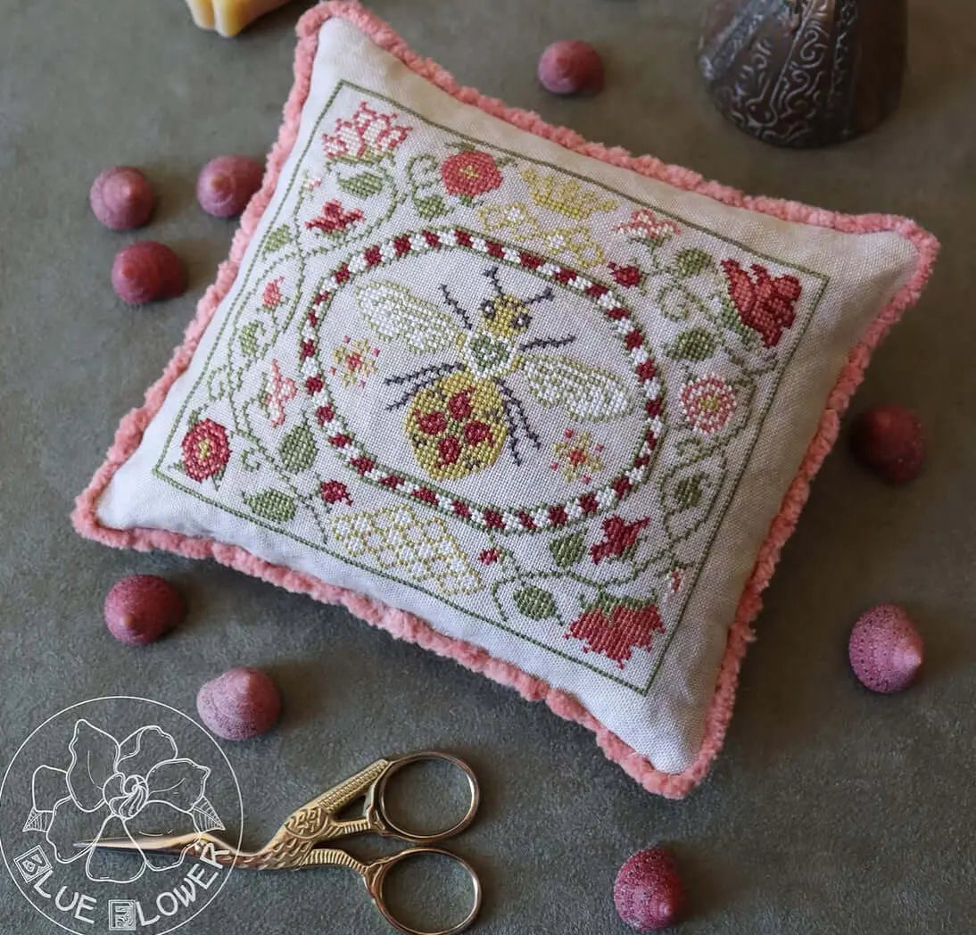 This cute bee is nestled right where she wants to be - in the middle of flowers. Cute framed or as a pin pillow.