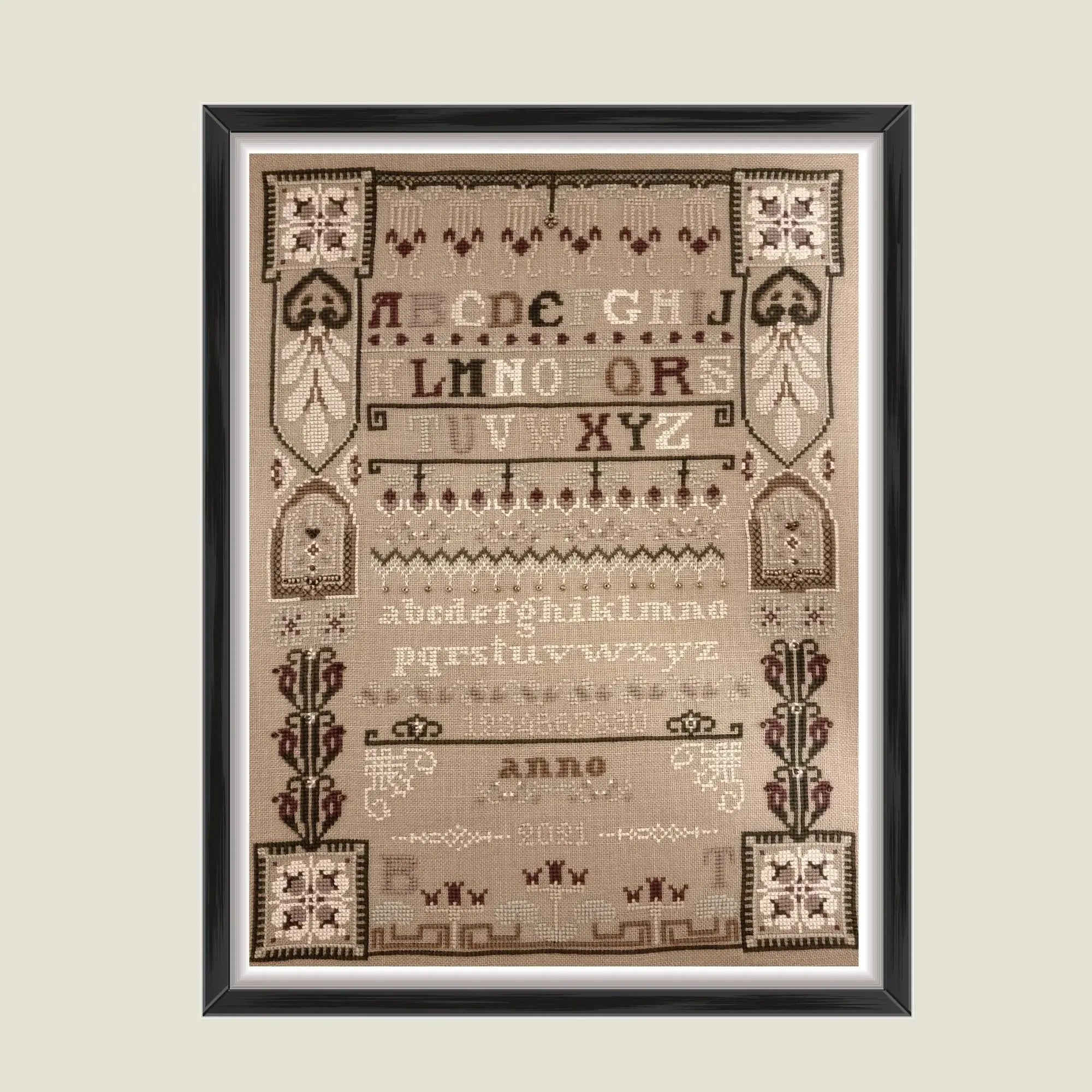 This sampler is done up in the colors of chocolate! (OK, or the colors of nature. Either way, it's beautiful with a touch of Art Nouveau added in some of the motifs.)