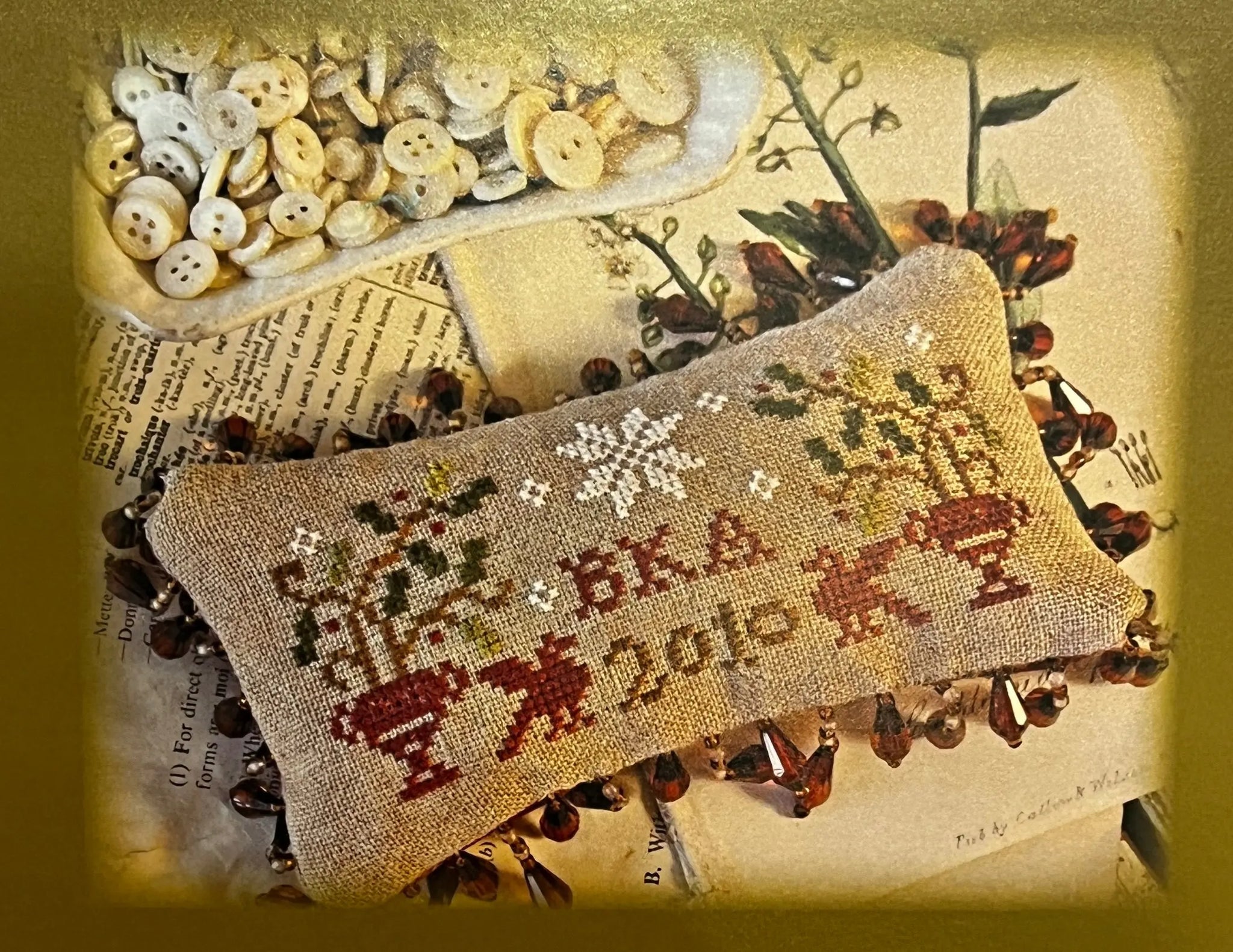 A pattern that abounds with Christmas! From the house with quilty roof and red window panes, to the berry border, and the deer to the Canadian geese, this one will be fun to stitch. Pattern also included for separate pin pillow.